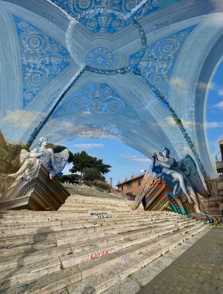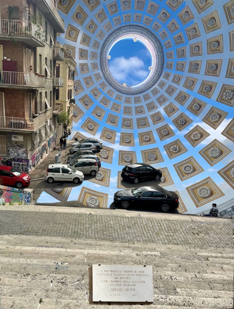 Wenn man, wie so oft im Alltag und im Leben, in Gedanken bereits bei dem Ziel weilt, zu dem man auf dem Weg ist, wird man überraschend unterbrochen, sobald man an jener Stelle vom Bürgersteig linker Hand zur Treppe abbiegt, die vorher dem Blick verborgen war. Plötzlich und unmittelbar tut sich ein weiter Blick auf. Denn diese Treppe ist breit, breiter als sie ihrem Zweck nach sein müsste, und reicht viele Stufen nach unten. Man kann von ihrem Sockel aus nicht nur über die unter ihr liegende Straße und Häuserreihe, sondern bis hinüber zum Stadtteil auf der anderen Seite des Tiber und die Hügel schauen. Außerdem muss man auf ihr verweilen, selbst, wenn man sie einfach nur benutzt, weil das Hinuntersteigen einige Zeit beansprucht. Wo immer man in Gedanken war, diese Treppe holt die Aufmerksamkeit für einen Moment unweigerlich in die aktuelle Gegenwart zurück. Und wenn man daran Freude hat, dann kann man es regelrecht genießen. Denn über dieser Treppe tut sich nicht einfach nur der Himmel auf, sondern ein großer, lichter Luftraum, der den Blick zum Himmel freigibt.